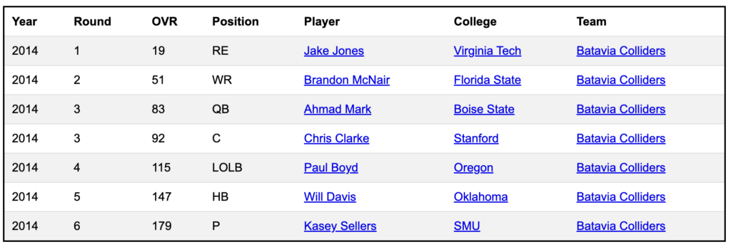 In 2012 a punter went second overall. In 2013, a tight end went first overall. So it’s no surprise that the 2014 draft was also wack, with a fullback going first overall. Then it started to make more sense as 3 corners went in the top five picks. National Champion Quarterback Mark Lambert was the first QB to go, getting picked 7th overall by the Bestine Banthas. But I think the best pick was South Carolina’s Gerald McGrew, a running back who went 4th overall to the Tooz Town GIMB (he’s got stupid numbers and 97-speed.)